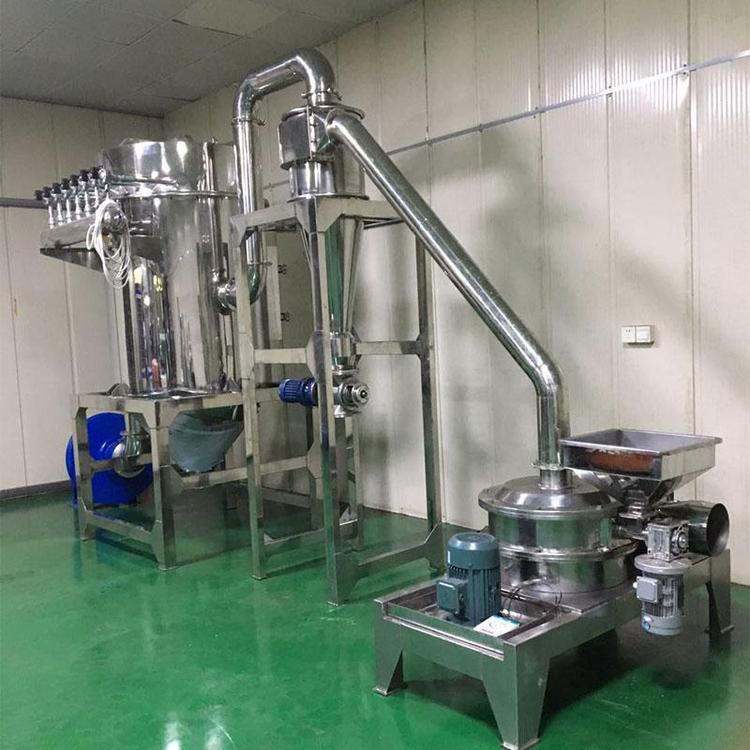 該設備由粉碎主機,旋風分離器,脈沖除塵箱及離心風機,冷風機等幾部分組成。物料經加料斗進入粉碎室,由高速旋轉的活動刀片和固定齒盤相互作用碰撞擊碎而獲得粉碎,粉碎好的物料經旋轉離心力和引風機的作用,進入旋風分離室,經關風機后出料,粉塵進入脈沖除塵箱,經過過濾筒過濾后回收再利用。